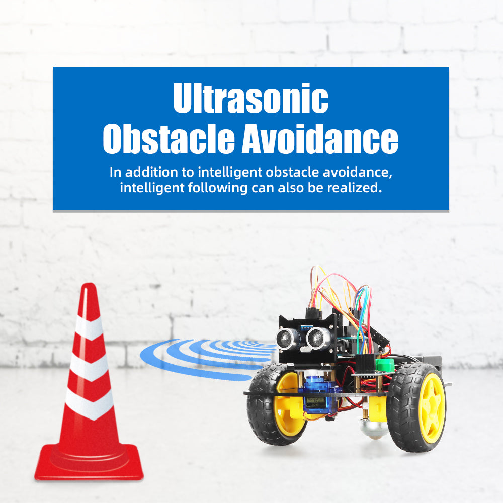 Ultrasonic Obstacle Avoidance Technology: Equipped with the HC-SR04 ultrasonic sensor module, the smart car autonomously detects obstacles and dynamically plans its driving route, ensuring efficient navigation and collision prevention.