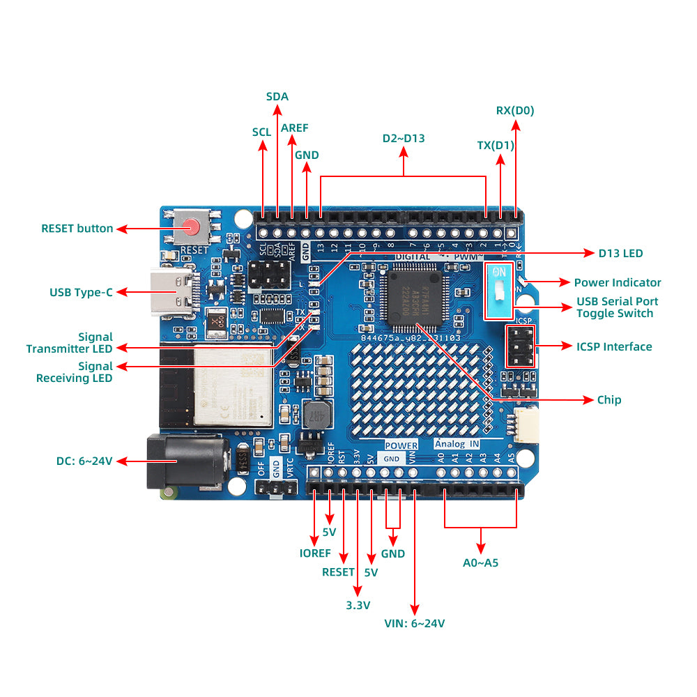 The UNO R4 WiFi maintains the same form factor, pinout, and 5V operating voltage as its predecessor, the UNO R3, ensuring a seamless transition from existing expansion boards and projects.