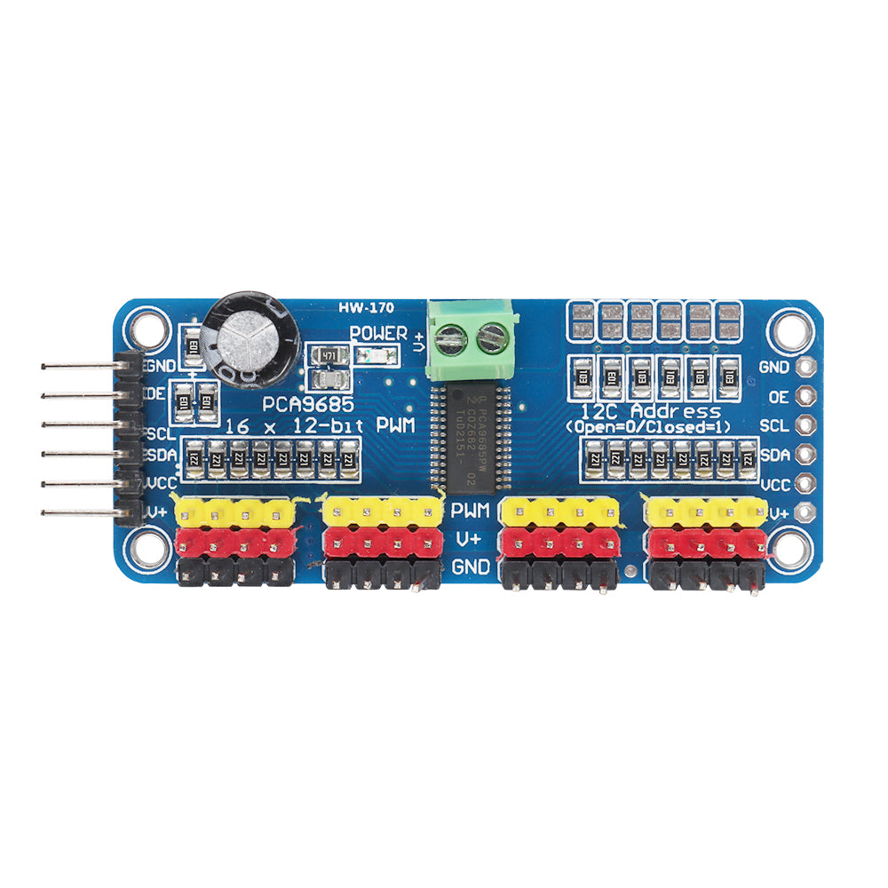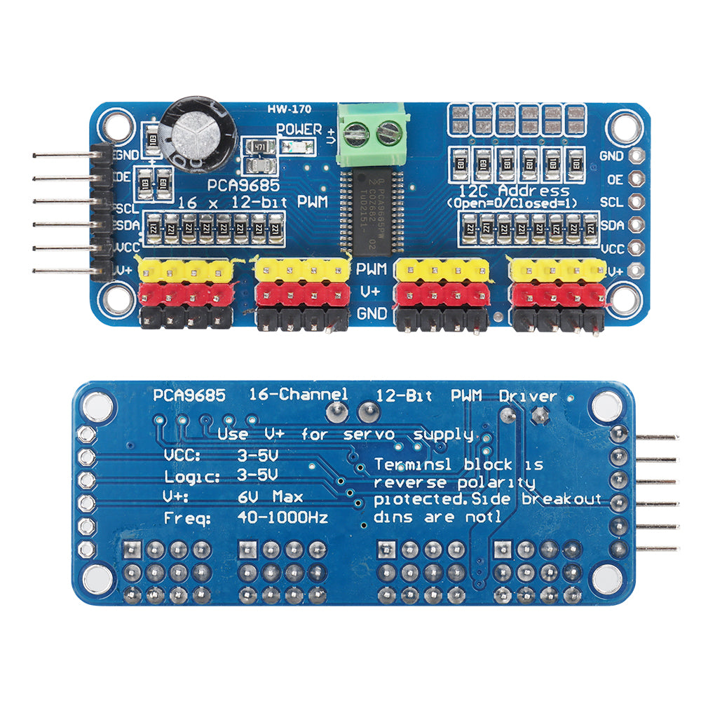 microcontroller has a limited number of PWM outputs, and you find yourself running out! Not with the Adafruit 16-Channel 12-bit PWM/Servo Driver - 12C interface. With this PWM and servo driver breakout, you can control 16 free-running PWM outputs with just two pins! Need to run more than 16 PWM outputs? No problem. Chain together up to 62 of these beauties for up to an outstanding 992 PWM output.