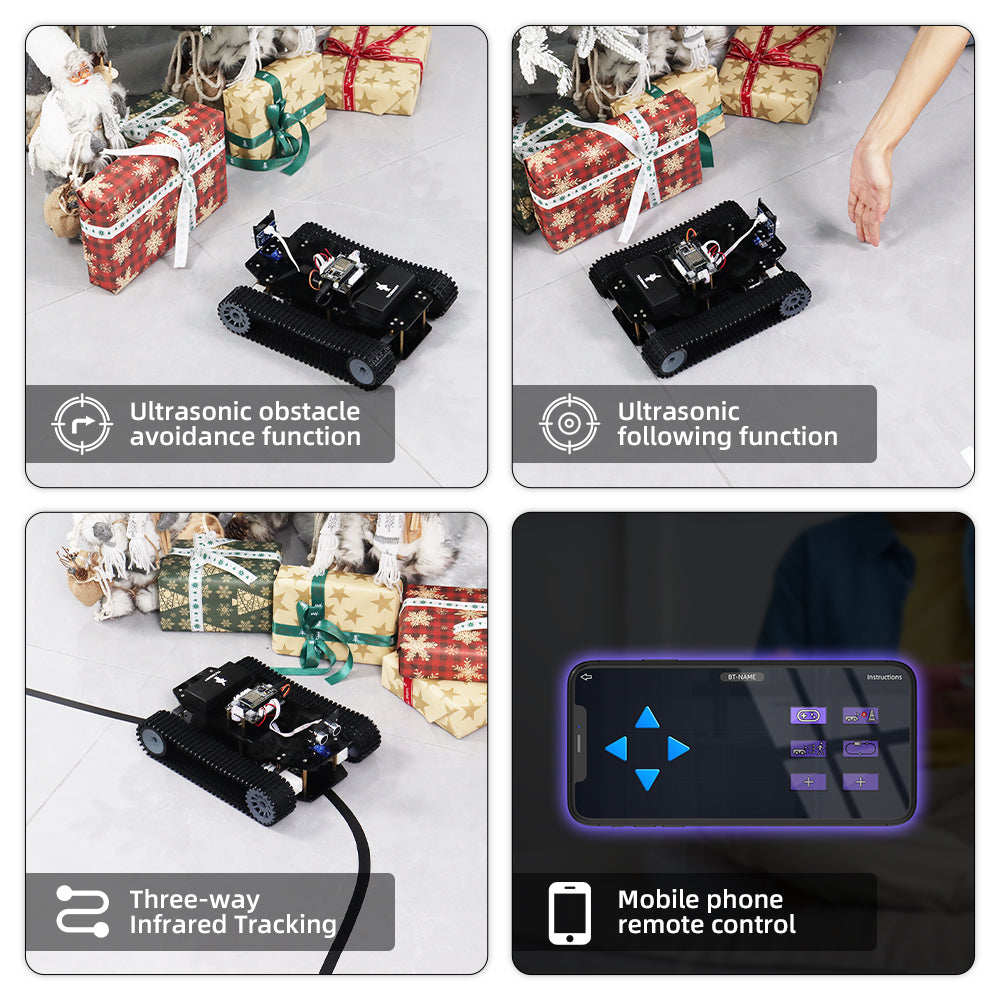 This intelligent tracked-wheel robotics car combines cutting-edge technology with endless fun. Built around the powerful ESP32 WROOM32 mainboard and enhanced with ESP32 L293D motor drivers, it delivers superior control and dynamic performance. Packed with advanced features like 180° servo-assisted obstacle avoidance, ultrasonic following, and 3-channel line tracking, this STEM robot opens exciting possibilities for tech exploration.